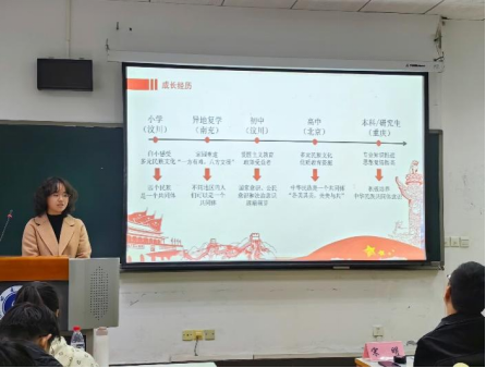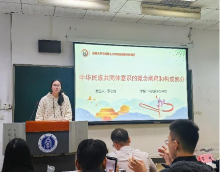 第一位进行主题分享的是来自太阳成集团tyc的罗心怡同学,她立足于习近平总书记关于“铸牢中华民族共同体意识”的系列重要讲话精神,从概念和内容两个方面与大家进行了分享,对命运共同体意识、政治共同体意识、经济共同体意识、文化共同体意识、社会共同体意识等维度对“中华民族共同体意识”进行了阐释。