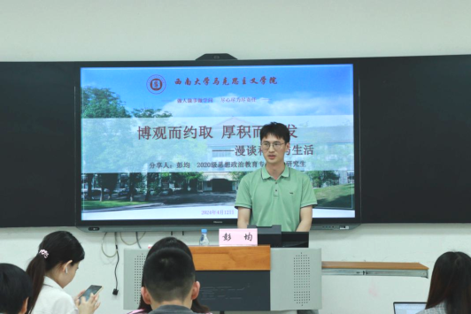 彭均在与现场同学的交流互动中,以其自身的学习经验和生活经历对同学们提出的博士生生活规划、文献阅读等相关问题一一耐心地解答,并给出了自己的建议。最后,他祝愿同学们能坚持初心,戒骄戒躁,在平凡的岗位上做出不平凡的事。