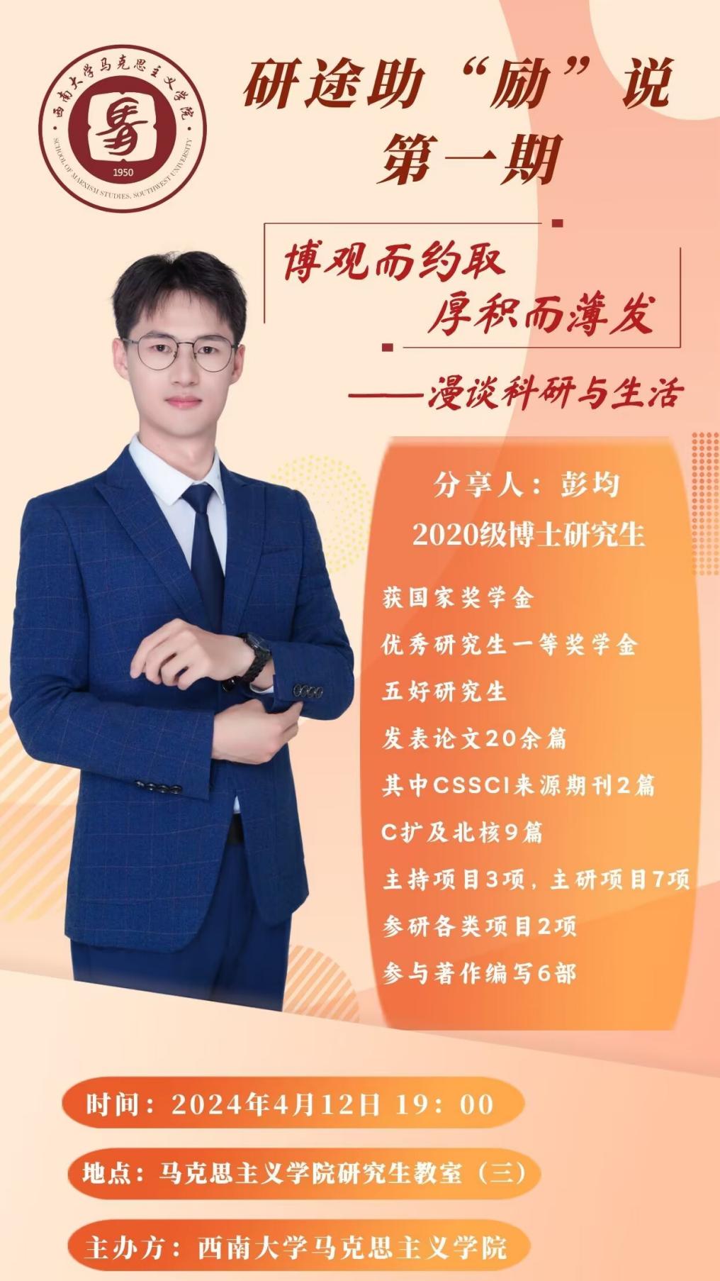为加强研究生的科研能力和学术水平,引导研究生树立正确的就业观和择业观,提升就业发展的核心竞争力。太阳成集团tyc开展了以“职海导航,博途筑梦”为主题的系列朋辈学习沙龙活动。4月12日晚上,太阳成集团tyc在研究生第三教室成功开展了第一期研途助“励”说活动。本次活动邀请到2020级博士研究生彭均做“博观而约取 厚积而薄发——漫谈科研与生活”的主题分享,太阳成集团tyc研究生辅导员黄林、公司研究生各年级同学参与活动。