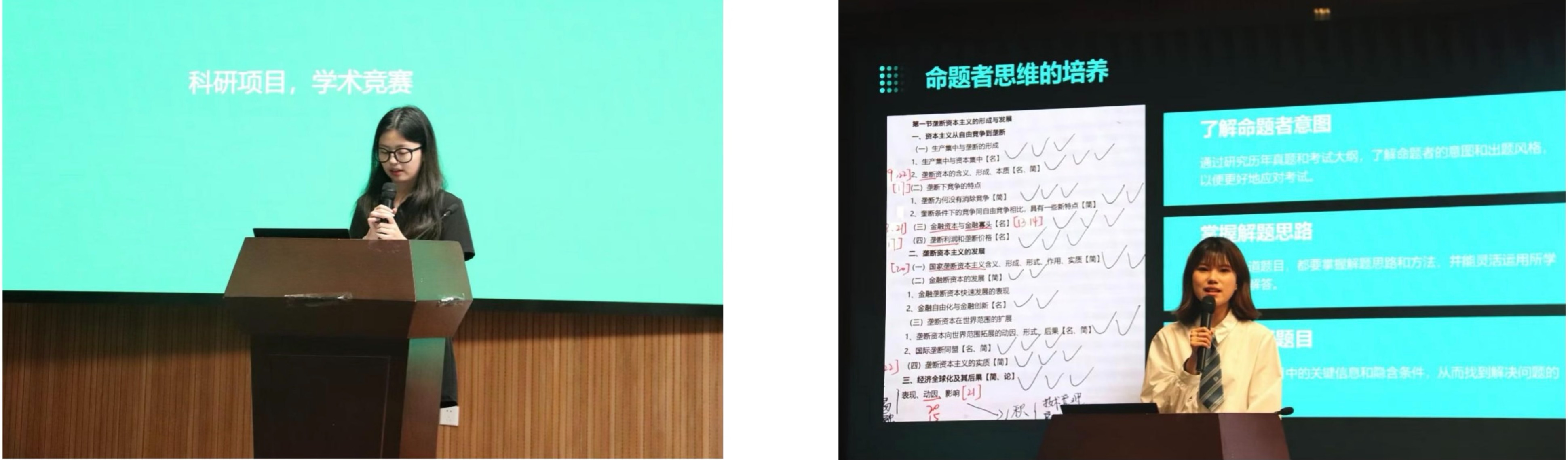 经验分享环节。刘思彤通过分享自己的保研经历,鼓励同学们不断完善自身的知识体系,她表示学习不是一蹴而就的,不断积累才能够实现自己的目标。杨晓龙从明确目标、合理规划、心态调整、院校选择几个方面分享了自己的经验,助力同学们的备考之路。乔若晴针对于择校、备考、焦虑等问题,鼓励同学们一定要认真挑选理想院校,做好充分备考准备,始终保持良好的身心状态,为达成自己的目标持续努力奋斗。