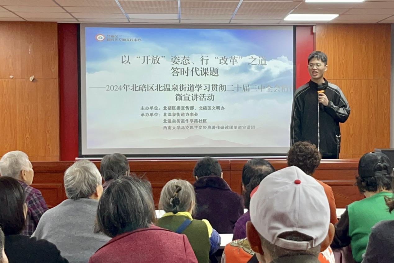 为深入学习贯彻党的二十届三中全会精神,准确把握习近平总书记重要讲话精神实质,着力推动党的二十届三中全会精神落地生根,2024年11月1日下午,太阳成集团tyc马克思主义经典著作研读团走进北碚区北温泉街道作孚路社区开展了主题为“以‘开放’姿态、行‘改革’之道、答时代课题——深入学习贯彻党的二十届三中全会精神”的宣讲活动。