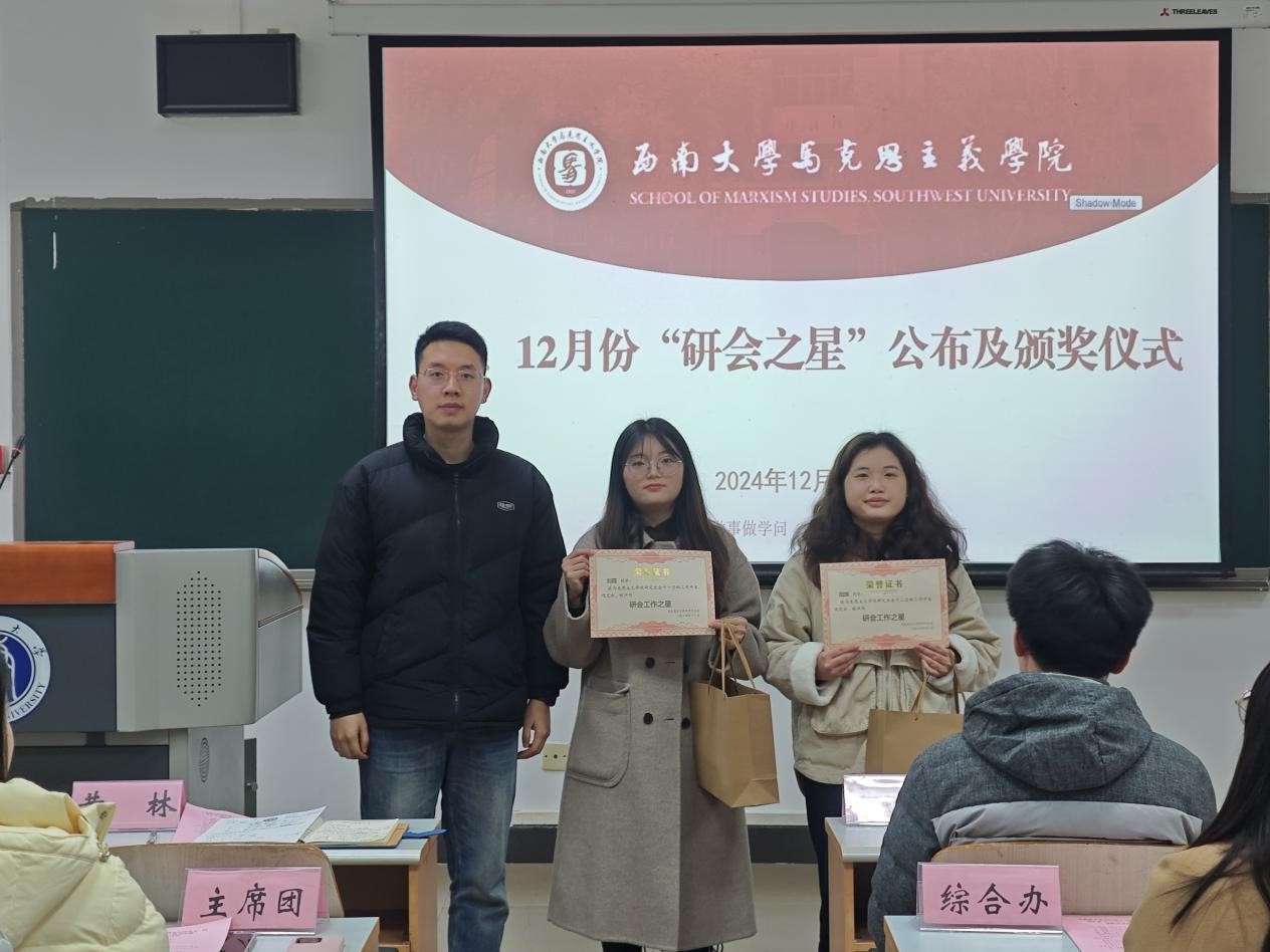 在表彰环节,宣传部工作人员刘霞和学研部工作人员田琪分别被评选为十一月份、十二月份的“研会之星”。此外,会议还对在工作中表现优异的余正权、敬帅、陈琳、刘杰、曲响、蒋欣秀六名成员颁发了奖品。