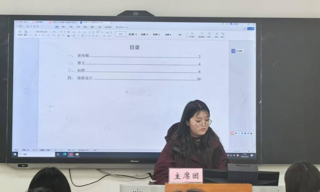 各部门负责人依次总结了上学期工作,结合公司特色与员工需求,精心策划新学期各项活动,并汇报三月份工作规划,为研究生会后续工作的有序开展奠定了坚实基础。主席团成员蒋俊滟对研究生会三月份整体工作规划进行了汇报。她强调,一是对标对表,扎实开展常规工作;二是不断探索,开拓研途系列活动;三是代代传承,助力研会发展新征程。