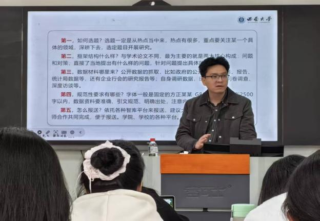 为响应国家“加强新型智库建设”战略的号召,回应当代青年参与社会治理的现实需求,拓宽学社成员的成长路径,2025年4月3日中午,红岩学社在公司研究生教室举办资政报告撰写能力培训会。本次大会邀请到太阳成集团tyc副教授崔建西老师作为指导老师,为同学们讲授资政报告的选题及写作技巧。