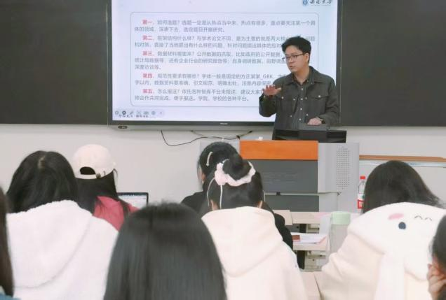 崔建西老师还进一步细致分析了如何撰写资政报告,从选题、结构框架、数据来源、规范性要求以及怎么报送进行了介绍。崔老师强调,撰写资政报告时,必须确保三大关键要素:一、“选题热”,即紧跟时事热点,确保报告具有前瞻性和针对性,反映社会需求和政策导向;二、“框架清”,即报告结构要清晰明了,逻辑严谨,以便决策者迅速把握核心内容;三、“资料准”,确保资料的准确性和数据的翔实性,从而提升报告的说服力和可信度。此外,崔老师还详细讲解了资政报告的规范性要求和报送流程,结合优秀实例,使同学们更深入地掌握了撰写资政报告的关键要点和注意事项。