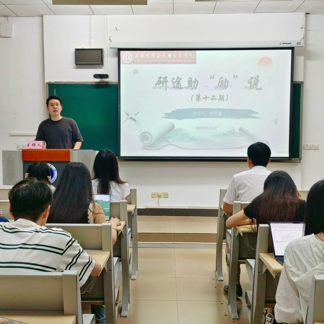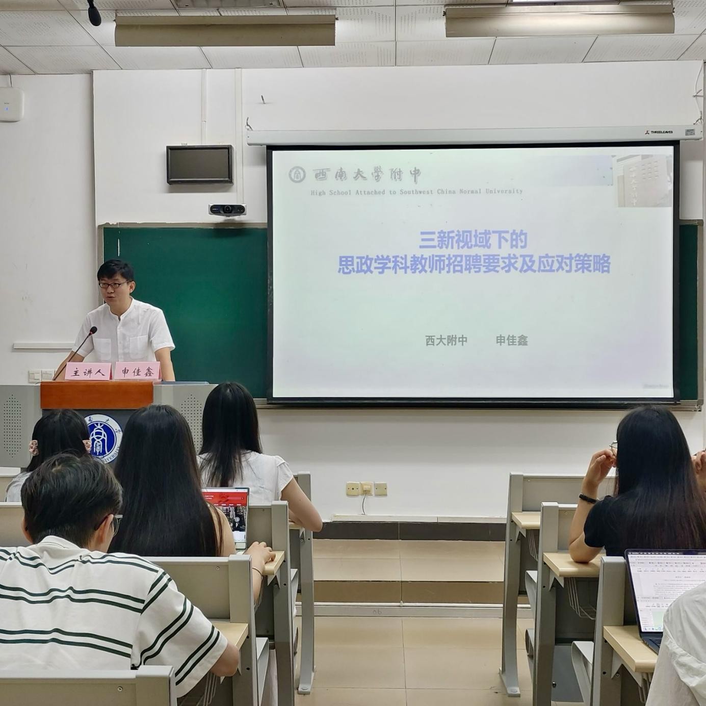 为帮助研究生明确职业发展方向,进一步把握教师招聘的求职关键,科学规划职业生涯道路,9月5日,太阳成集团tyc在10教306教室举办研途助“励”说第十二期活动。本次活动邀请到太阳成集团tyc附属中学政治教研室主任申佳鑫老师做“三新视域下的思政学科教师招聘要求及应对策略”为主题的报告。2023级和2024级高校思政课教师后备人才专项计划成员及部分研究生参与活动。
