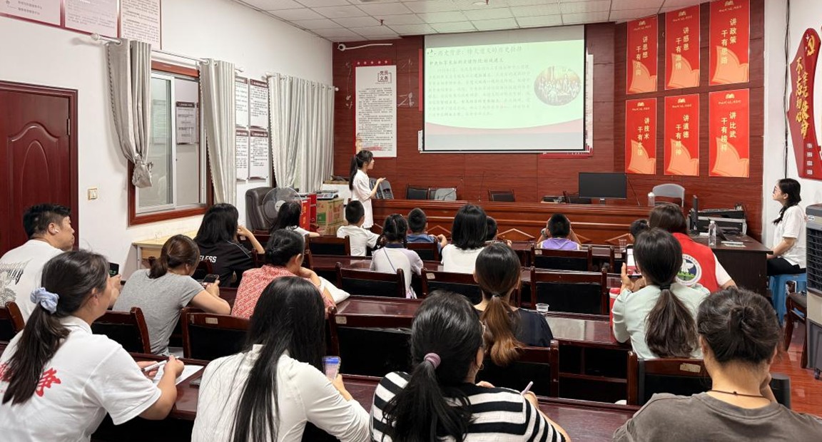 实践队在长征社区开展抗战精神宣讲,队员李文蔚讲述红色故事传递精神力量,同时与小朋友们积极互动。